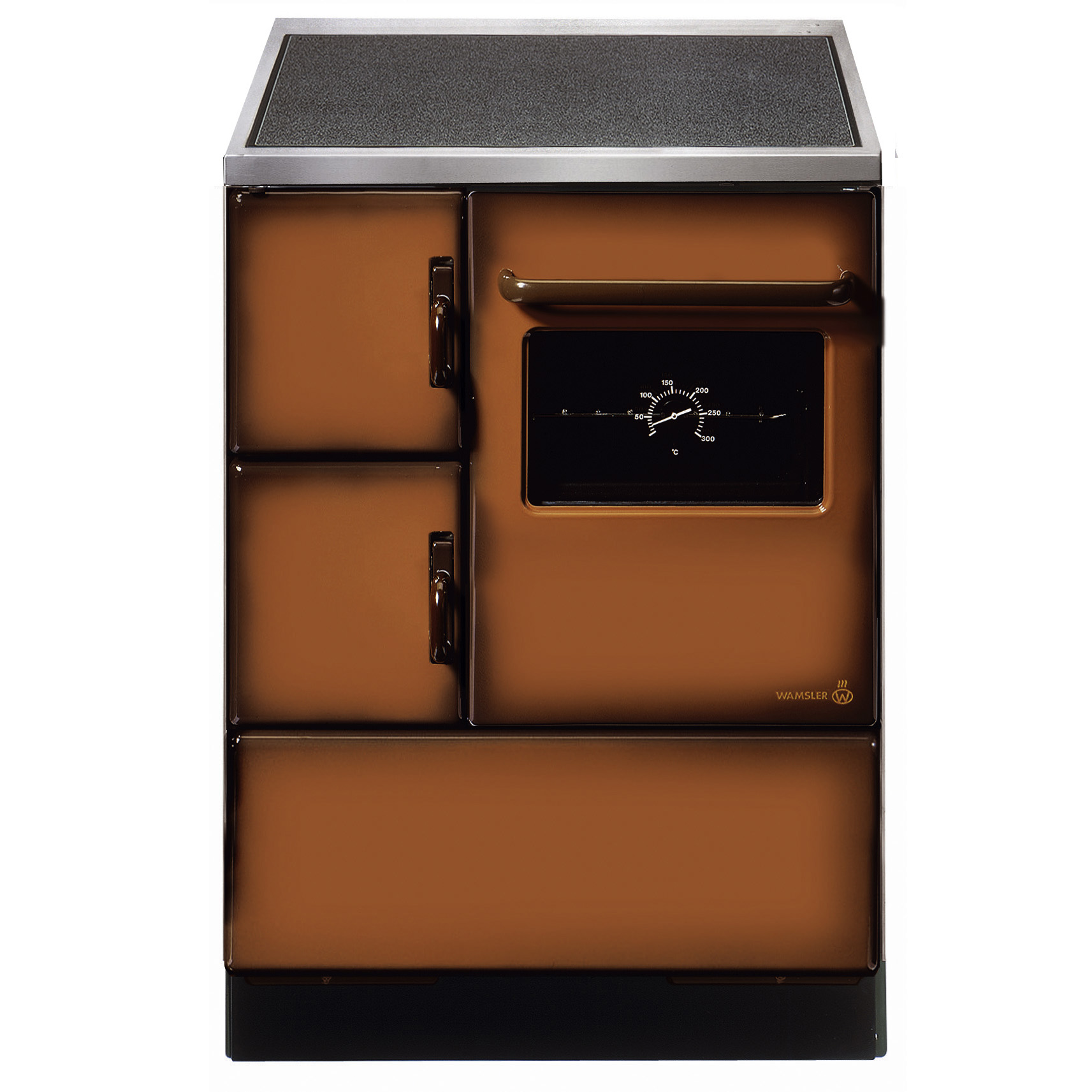 Ökonomisch, ökologisch, effizient und in klassischem Design: Der 60cm breite Festbrennstoffherd in Maron mit robustem, pflegeleichtem Cerankochfeld und massivem Edelstahlherdrahmen verfügt über ein komfortables Großraumbratrohr mit Temperaturanzeige und einen geräumigen Brennraum mit Sommer- und Winterroststellung und dem effektiven Wamsler Schadstoffreduzierungssystem (SRS). Anheizklappe, Luftzuführung und Leistung lassen sich bequem am Herdrahmen regeln und dank seiner höhenverstellbaren Füße lässt er sich problemlos in die Küchenzeile integrieren. Die farblich passende Abdeckhaube und Herdstange sind als Sonderzubehör bestellbar.