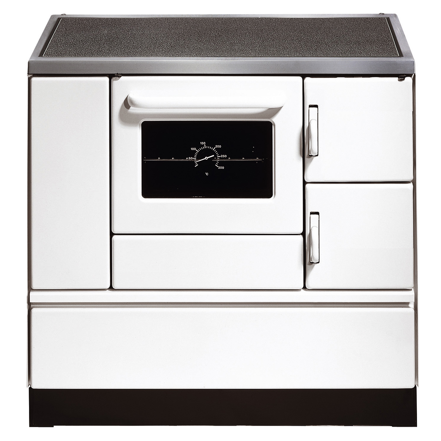 Ökonomisch, ökologisch, effizient und in klassischem Design: Der 91 cm breite Festbrennstoffherd in elegantem Weiß mit Ceranplatte und massivem Edelstahlherdrahmen verfügt über ein komfortables Großraumbratrohr mit Temperaturanzeige und einen geräumigen Brennraum mit Sommer- und Winterroststellung und dem effektiven Wamsler Schadstoffreduzierungssystem (SRS). Der bayrische Doppelzug unter dem Bratrohr sorgt für gleichmäßige Wärmeverteilung und ermöglicht so optimale Backergebnisse. Anheizklappe, Luftzuführung und Leistung lassen sich bequem am Herdrahmen regeln und dank seiner höhenverstellbaren Füße lässt er sich problemlos in die Küchenzeile integrieren. Die farblich passende Abdeckhaube, Wasserschiff und Herdstange sind als Sonderzubehör bestellbar.