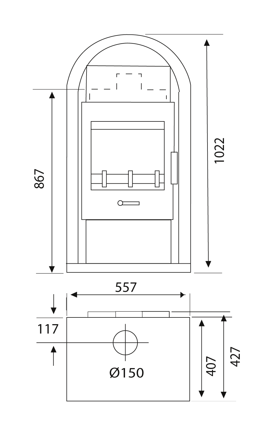 • Abgasanschluss oben: Ø 150 mm